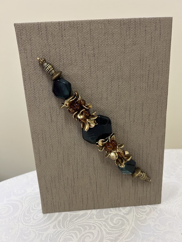 Caixa livro de MDF forrada couro sintético, interior em camurça, enfeite em pedras e metais.