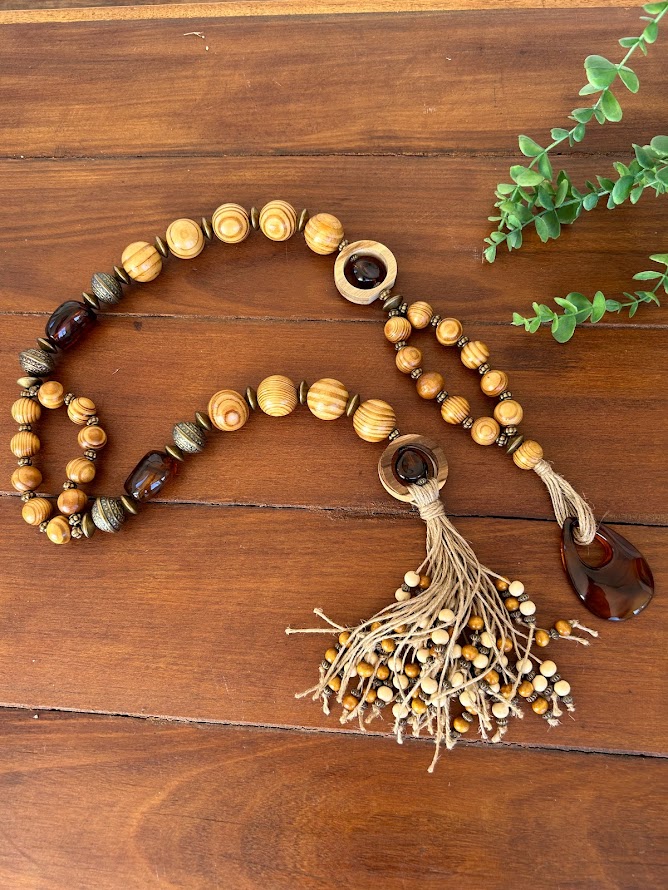 Colar de mesa com bolas de madeiras e pedras em resina tartaruga.