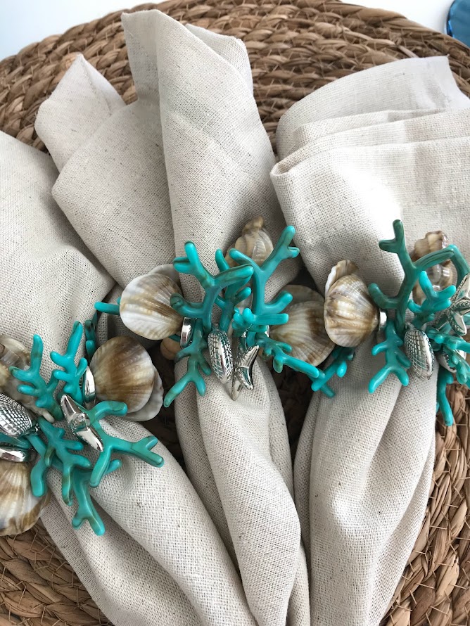 Valor unitário - Porta guardanapo da linha Maré em corais turquesa e conchas em resina, e detalhes niquel.