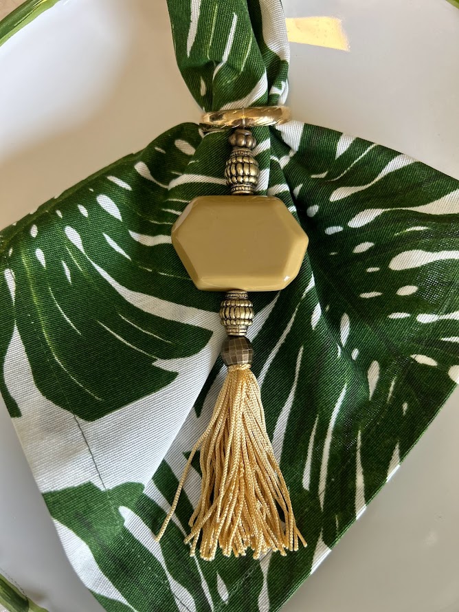 Valor unitário - Porta guardanapo com pedra em resina ocre, detalhes em ouro velho e pingente de seda ocre.