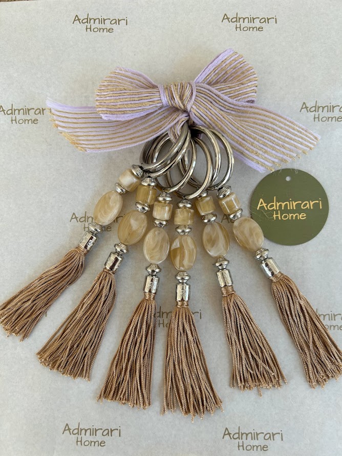 Valor unitário - Porta guardanapo pedra oval em resina bege marmorizada, detalhes em niquel e pingente seda.
