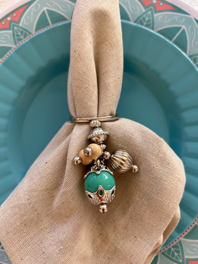 Valor unitário - Porta guardanapo pedra em resina turquesa, cacho em bolinhas de madeira e detalhes em niquel.