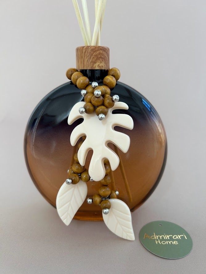 Vidro para aromatizador degrade marrom, pingente em folha resina e detalhes em madeira